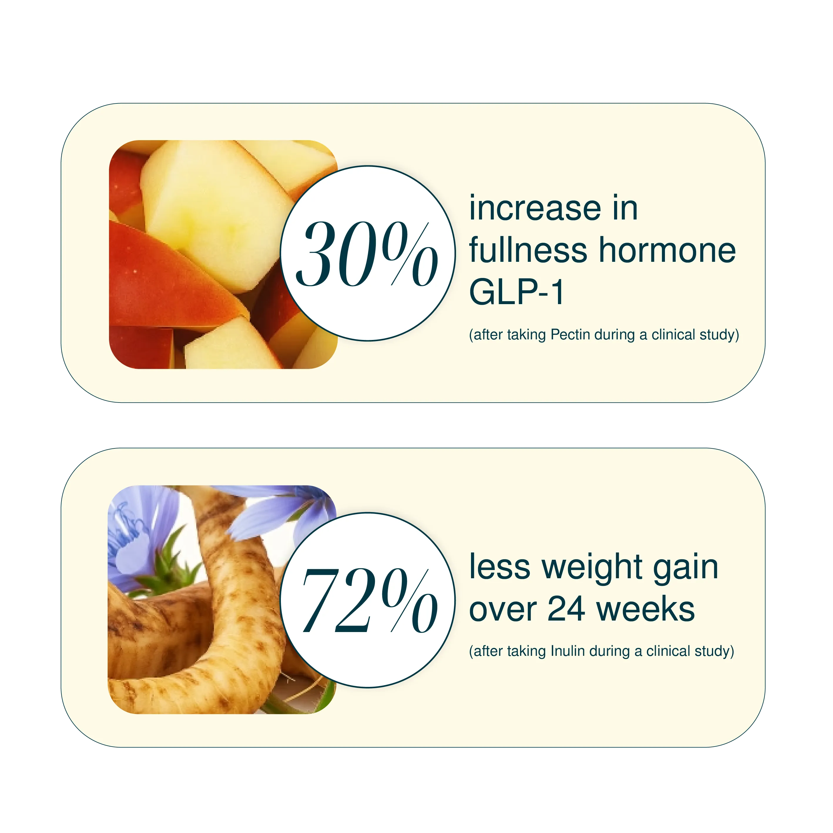 less weight gain over 24 weeks after taking Inulin during a clinical study. Fullness hormone levels were also significantly higher.
