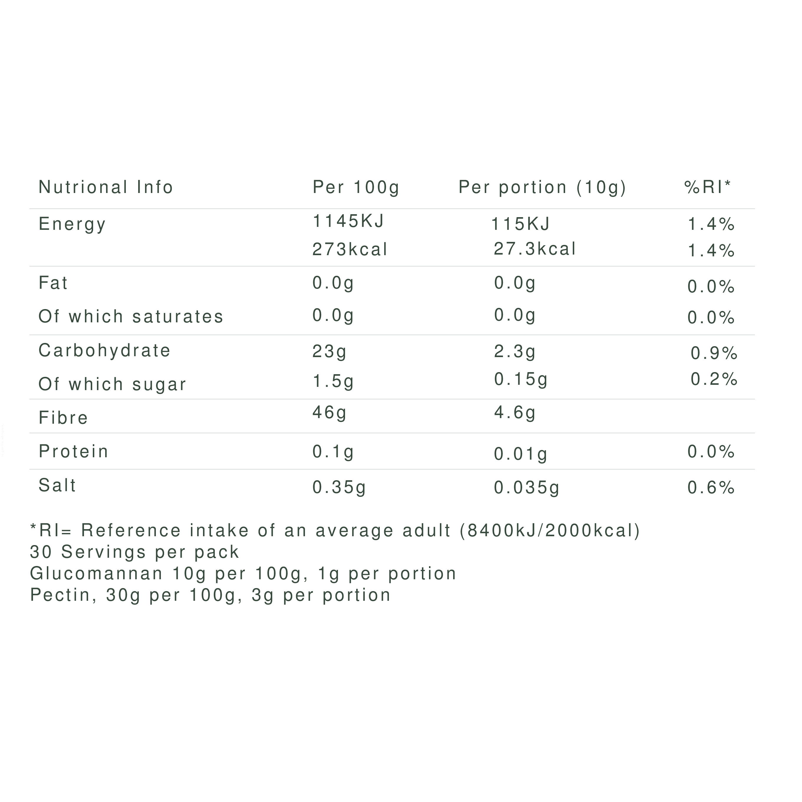 Inulin, Fibre and Starch powder with Glucomannan. A natural fibre blend crafted to promote weight loss and regulate blood sugar. Ingredients: Inulin (25%), Apple Pectin Soluble Fibre (25%), Maize Starch, Potato Starch, Glucomannan.